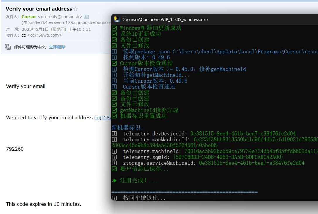 通过工具 cursor-free-vip ,可以自动帮你申请账号,只需要填上邮箱,自动申请,填入验证码,申请成功,就可以上手Cusor. 这个很方便,再加上CF的邮局功能,等于拥有无限个帐号。切换到新账号后原Cursor的会话记录可以继续使用。同一个Cursor,重新登录后不同账号后,也保留历史记录。